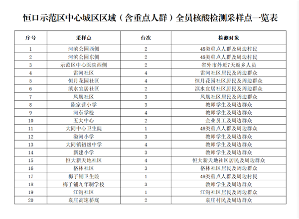 共設置20個采樣點、53個采樣臺(見附件),由相關責任單位統(tǒng)一負責采樣點設置、人員組織、秩序維護,檢測對象按現(xiàn)場工作人員要求,有序到指定地點進行采樣,避免人員聚集。