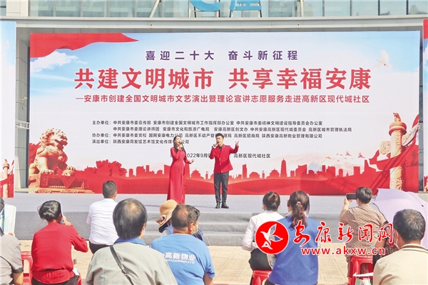 9月9日,一場以“共建文明城市,共享幸福安康”為主題的文藝演出和理論宣講活動在高新現代城社區(qū)舉行。整場活動,除了有群眾喜聞樂見的文藝節(jié)目,還設置有創(chuàng)建知識問答互動和創(chuàng)文知識專題宣講?,F場,志愿者們還熱情地向群眾發(fā)放印有創(chuàng)文內容的宣傳冊、涼扇、垃圾袋等,大家紛紛贊揚:“形式生動活潑,宣傳入腦入心!”