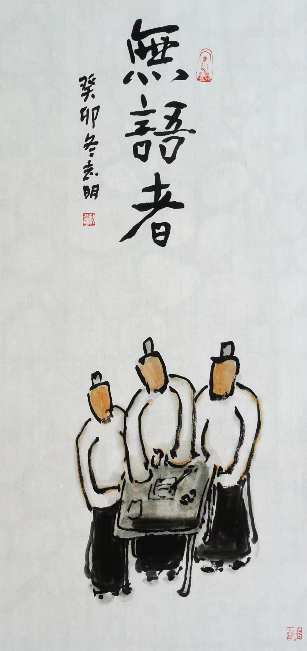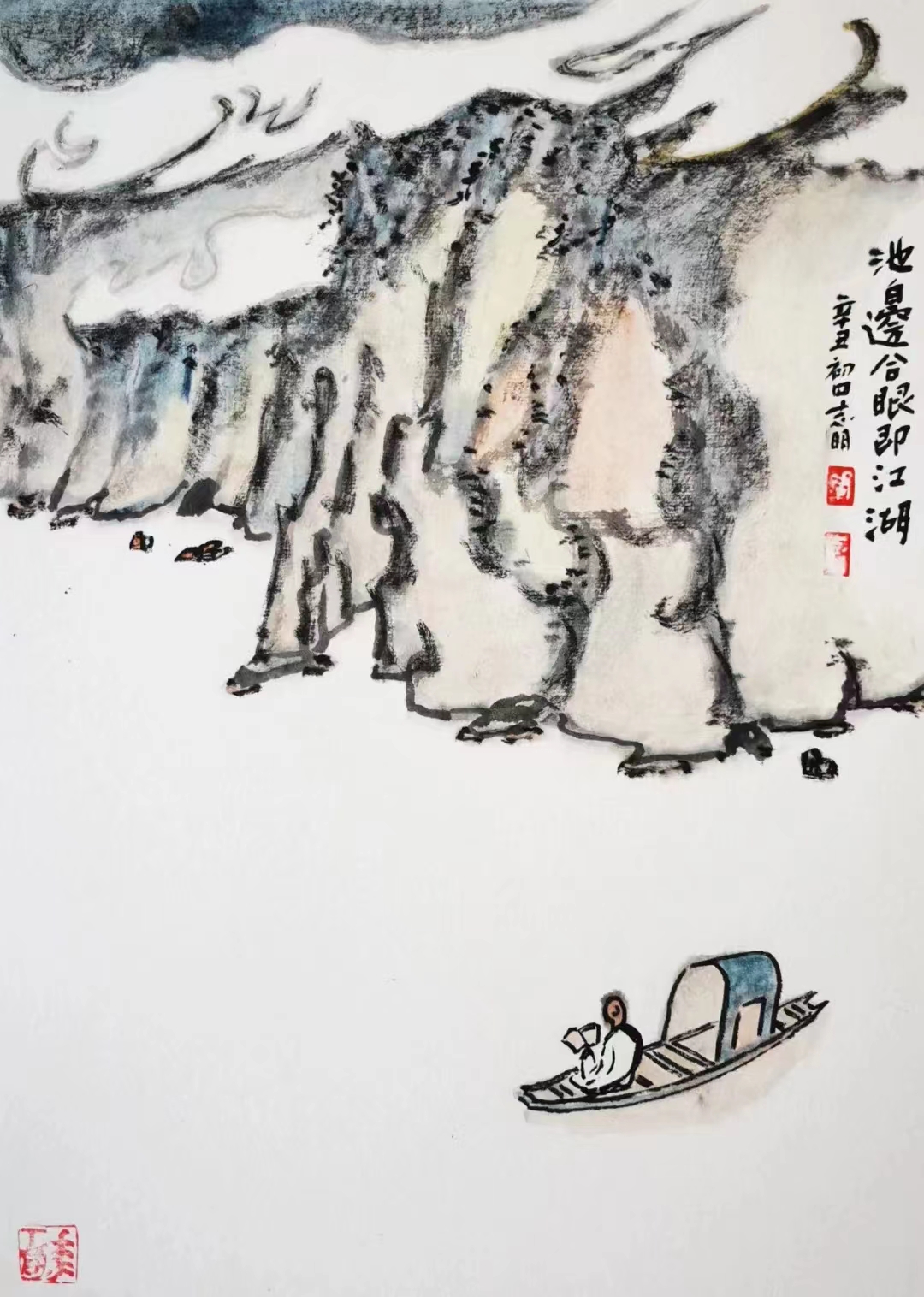 記得那一年的端午節(jié),鞏志明發(fā)來短信,是他寫的一首詩:綠粽黃酒聚江邊,白帆紅燭祭屈原。三千清淚流不得,九萬渾念飄上天。誰有郁悶誰散淡,何謂圓滑何忠奸。十丈風塵古今在,談笑真?zhèn)位聼煛?017年,我遷新居,鞏老師為我寄來小品畫《福到眼前》,我很喜歡,并懸掛至新居玄關(guān)。這些年,鞏志明老師常做影展畫展策劃及影評講座,自已也臨池不輟,水墨丹青,寄情抒懷,他的文人小品有思想性、有創(chuàng)造性。雖畫的是松風明月,小舟流水或遠古人物,但都寄托了他當下的心境,以消塊壘。誠如有人評論他為“吾師真文人,畫亦真性情!”他不僅只是身居畫室的怡情文人,他亦是心憂天下的豪俠。面對世間不平事,他也是激揚文字,揮斥方遒!在功利的當下,鞏志明尤其顯得難能可貴!?