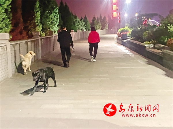 4月5日晚,安康城區(qū)城堤上有市民遛狗不牽繩。胡波 攝?