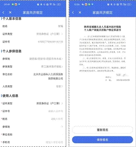 進(jìn)入信息填寫頁面后確認(rèn)本人及使用者信息,包括證件號、姓名、參保地、單位名稱(居民直接填寫社區(qū)信息)、手機(jī)號、開始日期、結(jié)束日期、順位支出等。綁定信息填寫完成后,選擇“查看個(gè)人承諾書并完成簽名”,進(jìn)入電子承諾書界面,閱讀承諾書信息后,點(diǎn)擊“簽名”按鈕完成電子簽名,點(diǎn)擊“保存簽名”后提交綁定信息。