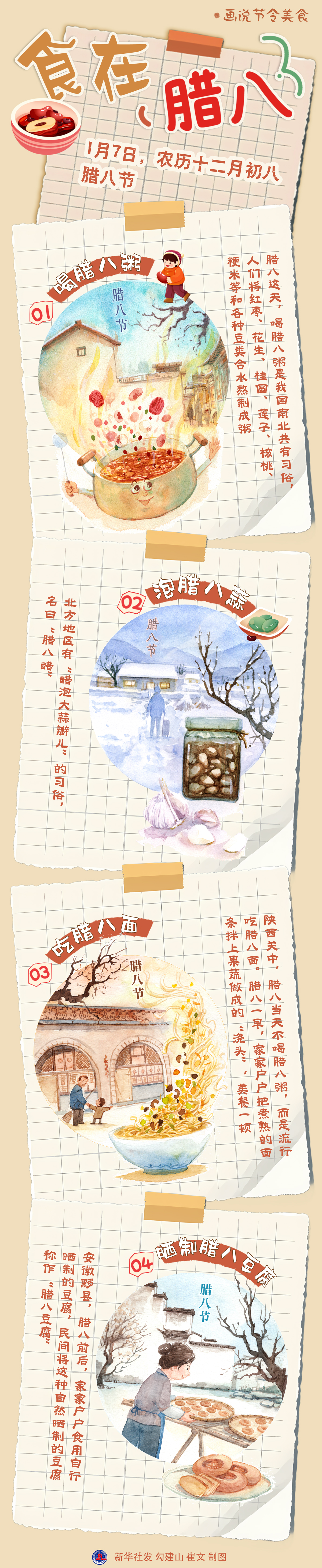 我國(guó)幅員遼闊,臘八習(xí)俗在各地也不盡相同。比如,北方地區(qū)有“醋泡大蒜瓣兒”的習(xí)俗,名曰“臘八醋”。除夕晚上,香噴噴、熱騰騰的餃子蘸上臘八醋,入口別具風(fēng)味;陜西關(guān)中,臘八當(dāng)天不喝臘八粥,而是流行吃臘八面。臘八一早,家家戶戶把煮熟的面條拌上果蔬做成的“澆頭”,美餐一頓;安徽黟縣,臘八前后,家家戶戶食用自行曬制的豆腐,民間將這種自然曬制的豆腐稱作“臘八豆腐”。