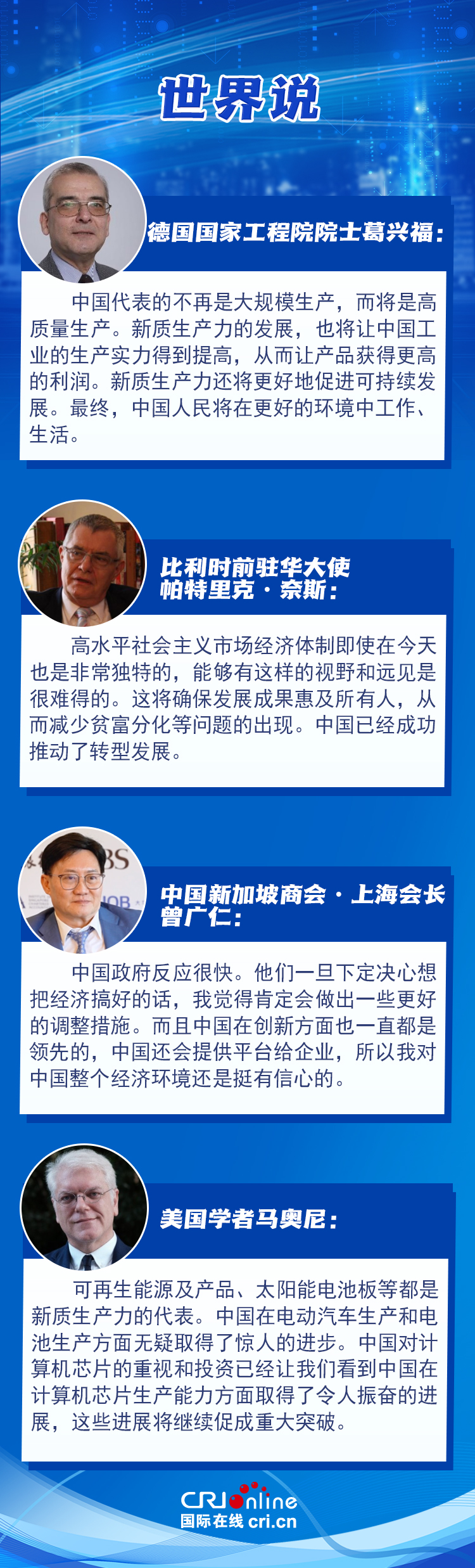 多位國(guó)際人士對(duì)中國(guó)經(jīng)濟(jì)發(fā)展充滿(mǎn)信心,高度肯定中國(guó)政府在經(jīng)濟(jì)發(fā)展中的核心引領(lǐng)作用,并對(duì)中國(guó)在高質(zhì)量生產(chǎn)及高精尖領(lǐng)域的創(chuàng)新領(lǐng)先地位表示贊賞。