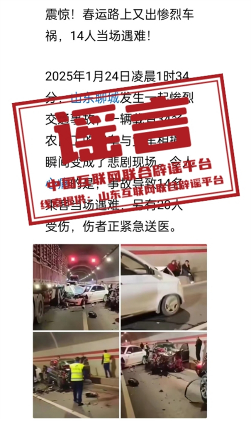真相:近日,有網(wǎng)民在網(wǎng)絡(luò)平臺發(fā)布一則“山東聊城一隧道內(nèi)發(fā)生多車相撞”的信息,稱“現(xiàn)場多車發(fā)生嚴(yán)重碰撞,場面慘烈,群眾滯留”,引發(fā)關(guān)注。經(jīng)當(dāng)?shù)鼐胶藢崳綎|省聊城市從未發(fā)生過類似交通事故,該信息內(nèi)容純屬虛假編造。經(jīng)查,網(wǎng)民褚某某和韓某為博取關(guān)注、吸引流量,將外省市發(fā)生交通事故的圖片視頻移花接木,稱“聊城發(fā)生交通事故”并憑空捏造傷亡人數(shù),造成不良影響。目前,二人已被公安機關(guān)依法打擊處理。(來源:山東互聯(lián)網(wǎng)聯(lián)合辟謠平臺、聊城市網(wǎng)上辟謠平臺)