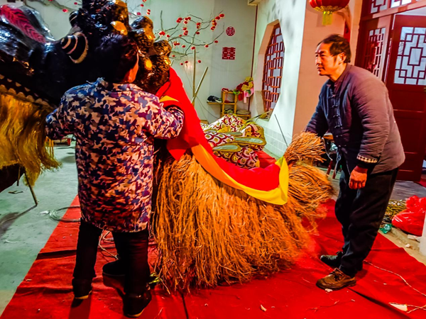 “龍頭是整條龍的重點(diǎn),刻畫要逼真,色彩還得鮮艷。忙碌了一年的鄉(xiāng)親們,就希望在正月里,抖擻精神,舞動起來。”說話間,李忠寶一雙巧手上下翻飛,正在修剪龍頭花燈的胡須,忙得額頭沁出了汗珠。兒子李石磊則忙著幫烤、粘、填、糊、上色……在他們父子倆的精雕細(xì)琢下,一個威風(fēng)凜凜、栩栩如生的花燈道具龍頭,總算扎制完成。