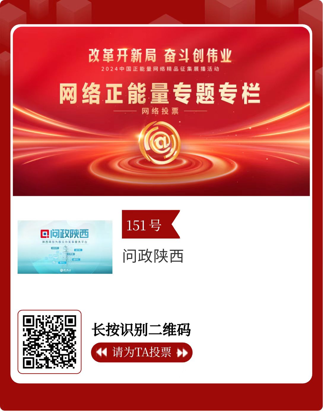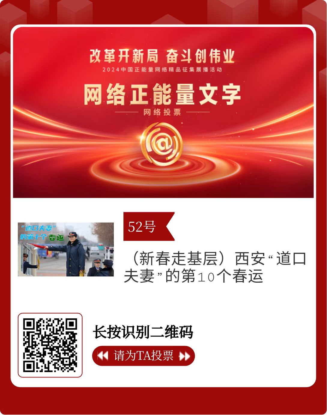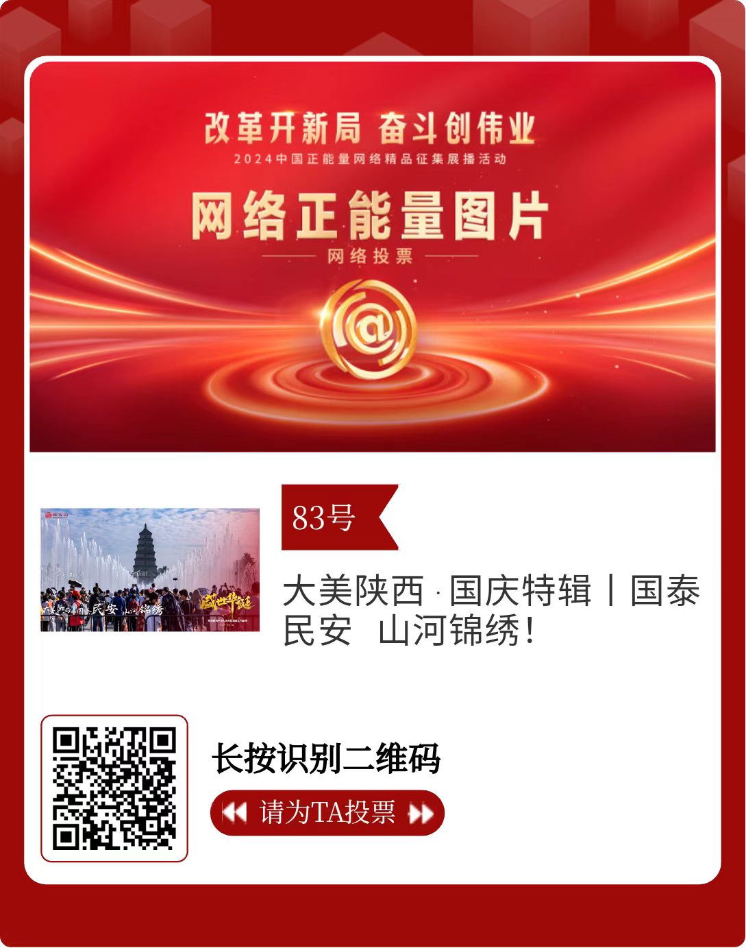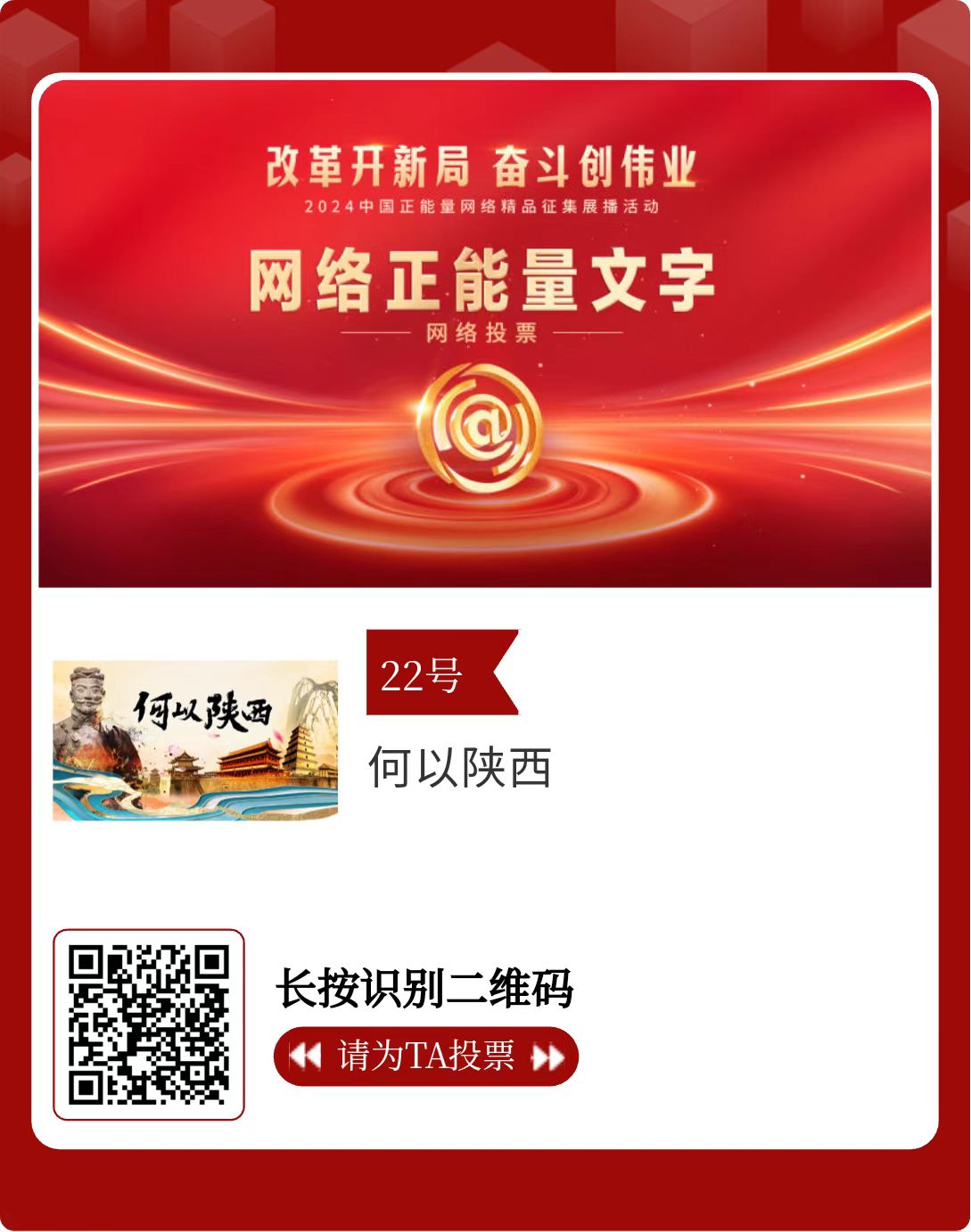 陜西省32件作品進(jìn)入投票環(huán)節(jié),投票時(shí)間為2月15日至2月21日,投票結(jié)果將作為中國(guó)正能量網(wǎng)絡(luò)精品遴選的重要參考。中國(guó)正能量網(wǎng)絡(luò)精品,期待每一個(gè)充滿正能量的你投出點(diǎn)贊一票。