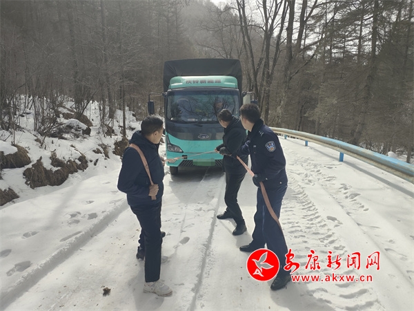 2月19日12時許,寧陜縣公安局龍王派出所值班民警接到救援電話:有一輛貨車駕駛到太山廟鎮(zhèn)太山村某路段被困,請求救助,接到電話后龍王派出所民輔警迅速趕往事發(fā)地。當時大雪已經(jīng)下了一天,該路段因山路崎嶇坡陡,部分路面結(jié)冰打滑,民警克服天氣不利條件趕到現(xiàn)場。到現(xiàn)場后,民警看見一輛貨車被困在雪地中,民警查看現(xiàn)場環(huán)境后,利用攜帶鐵鍬、拖車繩等救援物資迅速開展工作,經(jīng)過2個多小時終于安全將被困車輛牽引至安全區(qū)域。