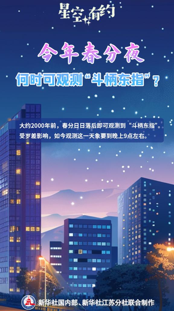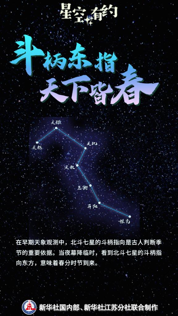 3月20日將迎來(lái)春分節(jié)氣。這一時(shí)節(jié)草長(zhǎng)鶯飛、花滿枝頭,天上的星斗也指示著春天的到來(lái)。我國(guó)古代有“斗柄東指,天下皆春”的說(shuō)法,意思是當(dāng)夜幕降臨時(shí),看到北斗七星的斗柄指向東方,意味著春分時(shí)節(jié)到來(lái)。