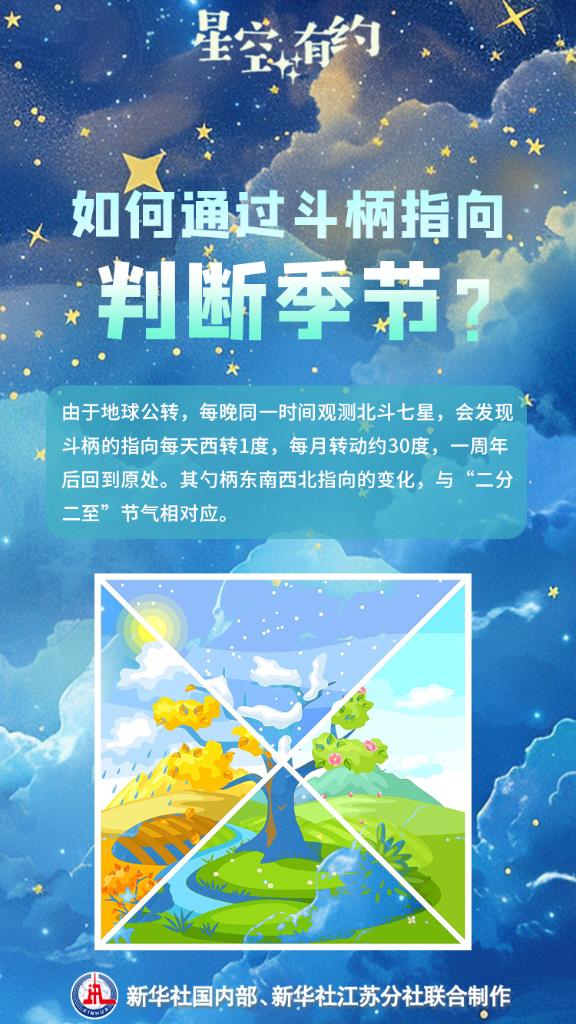 由于地球自轉(zhuǎn)軸指向北極星方向,從地球上看,北斗七星每天圍繞著北極星做圓周運(yùn)動(dòng)?!耙虼耍湃擞帽倍菲咝桥袛嗉竟?jié)的方法相對(duì)粗略,適合日落后的入夜時(shí)分。隨著時(shí)間推移,斗柄的指向會(huì)有明顯變化。例如,春季天黑后不久,斗柄大體指向東方,但到午夜就轉(zhuǎn)向南方,天亮前則指向西方?!蓖蹩瞥f(shuō)。