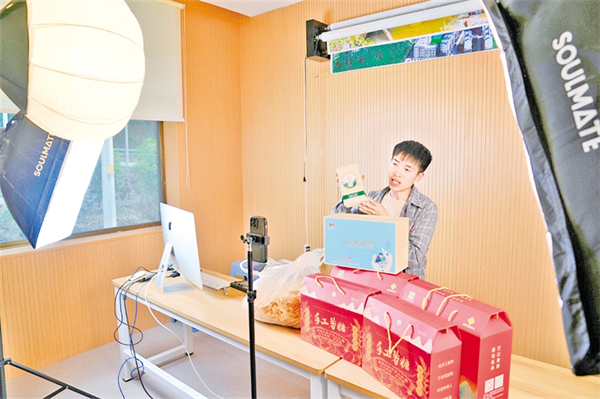 王幫樂在石門鎮(zhèn)電商直播基地銷售當(dāng)季的小溝茶葉
