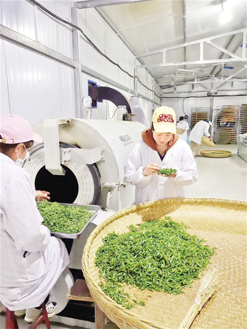 沿著九曲山路攀至絲鋪村五龍山,1200米的海拔高地,500畝生態(tài)茶園豁然舒展在眼前。茶農(nóng)們星羅棋布地穿梭在茶園,夏茶葉紛紛從茶樹(shù)間跌落。“高山茶回甘足,這片云海就是天然保鮮庫(kù)。”村支部書(shū)記蔡家文輕捻茶葉,陣陣清香沁人心脾。旬陽(yáng)五龍山農(nóng)民種植專(zhuān)業(yè)合作社負(fù)責(zé)人王志富打開(kāi)茶廠卷簾門(mén),生產(chǎn)線熱氣蒸騰?!叭ツ晡覀兪召?gòu)了3000公斤鮮葉,加工了1000公斤干茶,產(chǎn)值達(dá)到30萬(wàn)元,輻射帶動(dòng)周邊村民端穩(wěn)飯碗?!?/p>