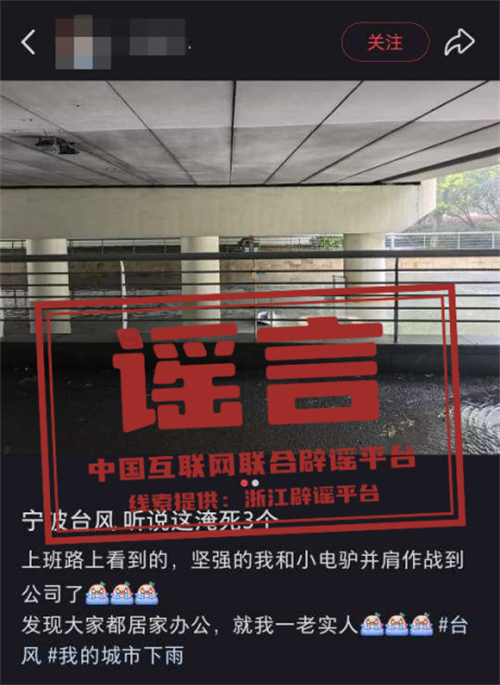 真相:7月30日9時許,某社交平臺網(wǎng)民沈某(女,23歲,寧波鄞州人)發(fā)帖造謠稱“寧波一涵洞內(nèi)車輛被淹,有3人淹死”。經(jīng)核查,該內(nèi)容系謠言,目前公安機(jī)關(guān)已對沈某依法予以批評教育,該帖文現(xiàn)已刪除。