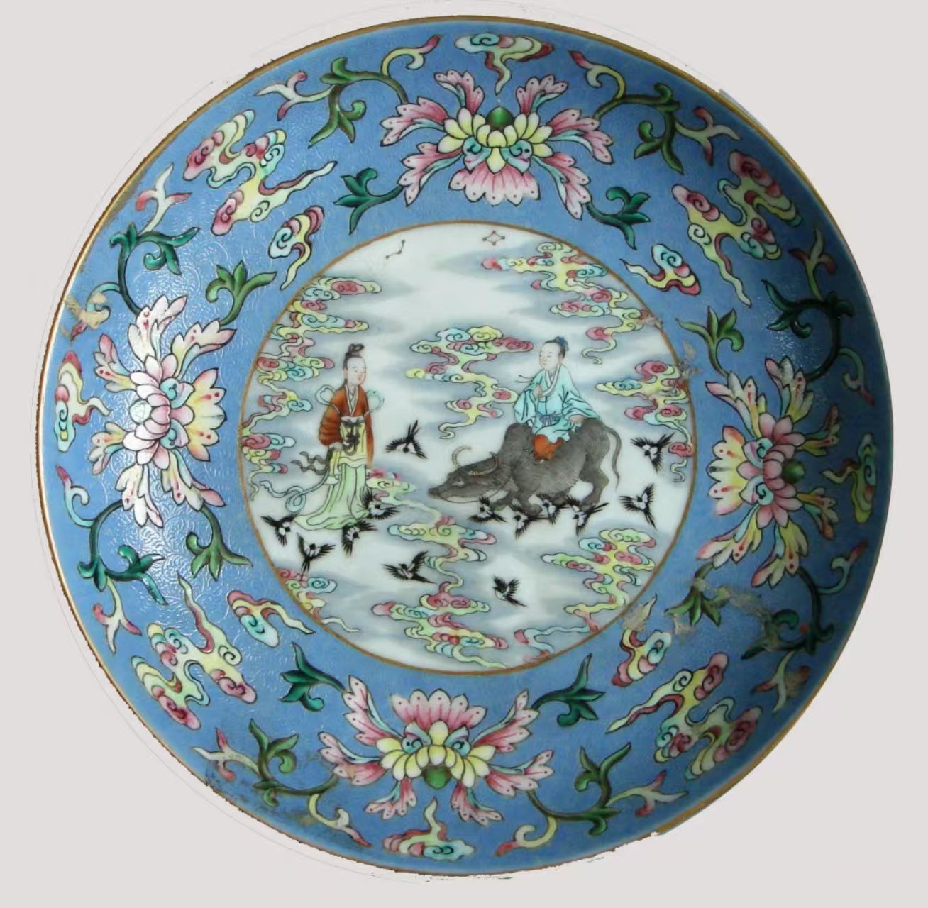 北京藝術(shù)博物館收藏的清代景德鎮(zhèn)官窯粉彩人物圖盤,就像一幅流動的七夕畫卷。此盤工藝精湛,口沿涂金,熠熠生輝,盡顯皇家氣派。盤內(nèi)外壁采用“粉彩軋道”工藝,天藍釉地上淺淺的卷草紋似微風輕拂,粉彩花卉與朵云紋相互映襯,如夢如幻。盤內(nèi)底描金圓形開光處,粉彩繪就的人物故事圖案更為生動:牛郎坐于牛背,手握韁繩,深情凝望;織女身姿婀娜,嬌羞回望,二人似在互訴衷腸。背景中祥云繚繞、星辰閃爍、鵲鳥紛飛,為這場相會營造了浪漫的氛圍。外底“鵲橋仙渡”四字,點明主題。