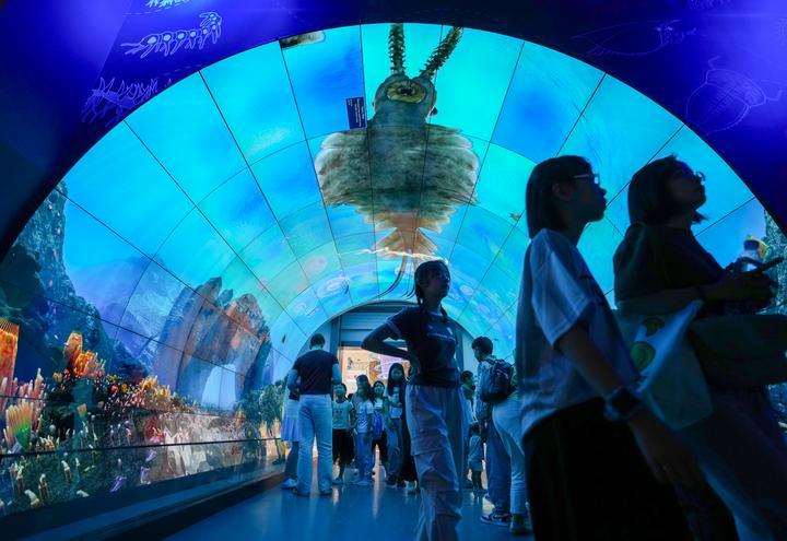 025年7月15日,游客在玉溪市澄江化石地世界自然遺產(chǎn)博物館“寒武紀海底隧道”參觀。