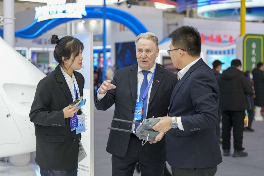 1月6日,在2026哈爾濱國(guó)際冰雪經(jīng)濟(jì)博覽會(huì)現(xiàn)場(chǎng),參會(huì)嘉賓(中)在了解一款工業(yè)無(wú)人機(jī)的參數(shù)和性能。新華社記者 王松 攝