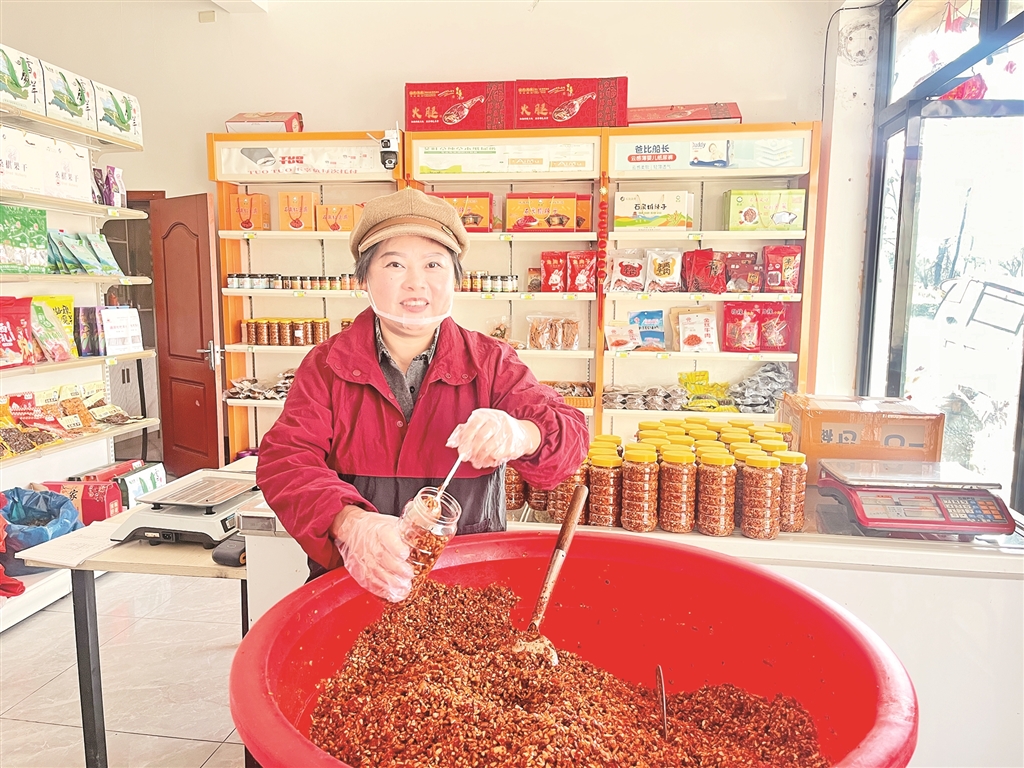 生意有了起色,丈夫的身體也逐漸康復(fù),生活終于重新亮堂起來。作為鎮(zhèn)人大代表,劉小洪深知,一人富不算富,大家富才是真的富。她主動(dòng)分享直播帶貨經(jīng)驗(yàn),帶動(dòng)周邊村民參與特產(chǎn)加工和網(wǎng)絡(luò)銷售。她優(yōu)先聘請(qǐng)村里的留守婦女和困難家庭來幫忙,手把手教她們技術(shù)。為了保證產(chǎn)品的純正鄉(xiāng)味,她堅(jiān)持從本村及周邊村采購(gòu)黃豆、辣椒、野油菜、干豇豆等原材料,平均每年收購(gòu)約1萬(wàn)公斤黃豆、2000余公斤辣椒、2000余公斤野油菜及干豇豆,讓鄉(xiāng)親們的農(nóng)產(chǎn)品有了穩(wěn)定銷路,也變成了實(shí)實(shí)在在的收入。