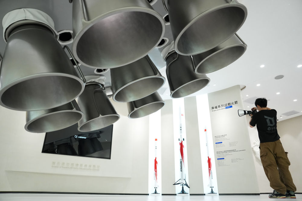 強(qiáng)化產(chǎn)業(yè)圈聯(lián)動(dòng)發(fā)展,是北京持續(xù)提升科技成果區(qū)域內(nèi)轉(zhuǎn)化效率和比重的有效舉措。以商業(yè)航天產(chǎn)業(yè)為例,目前,扎根北京的商業(yè)航天百強(qiáng)企業(yè)、上市企業(yè)和獨(dú)角獸企業(yè)約占全國半壁江山。產(chǎn)業(yè)鏈覆蓋運(yùn)載火箭、衛(wèi)星制造、地面站及終端設(shè)備、衛(wèi)星應(yīng)用服務(wù)全領(lǐng)域。這是2025年6月18日在北京經(jīng)濟(jì)技術(shù)開發(fā)區(qū)藍(lán)箭航天空間科技股份有限公司拍攝的朱雀系列運(yùn)載火箭模型。