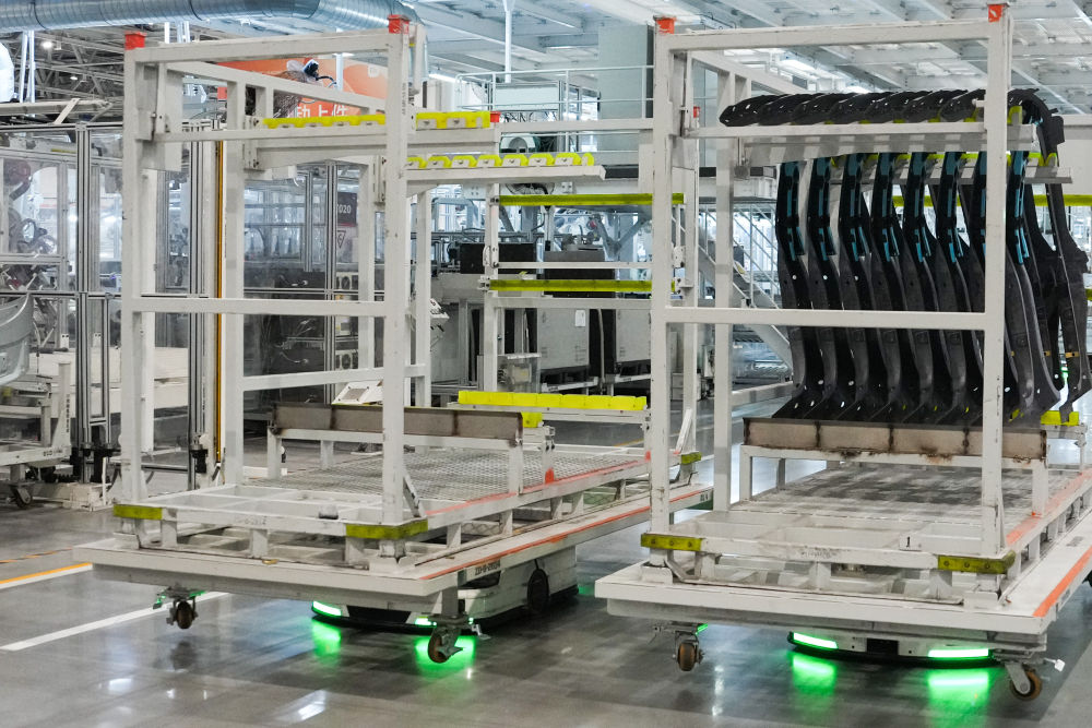從研發(fā)制造到測試應(yīng)用,北京發(fā)揮汽車產(chǎn)業(yè)長期積累,積極擁抱新品牌、新技術(shù),新模式,新能源汽車產(chǎn)業(yè)蓬勃發(fā)展,產(chǎn)業(yè)鏈供應(yīng)鏈不斷鞏固完善。這是自主移動(dòng)機(jī)器人在北京小米汽車工廠搬運(yùn)物資(2025年6月16日攝)。