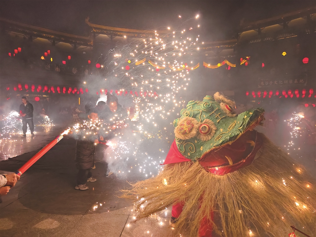2月19日,石泉縣秦巴風情園里的“燒獅子”引得眾人圍觀。舞獅人配合默契,游客點燃煙花筒,現(xiàn)場火花四濺、氣氛熱烈。楊勇 攝