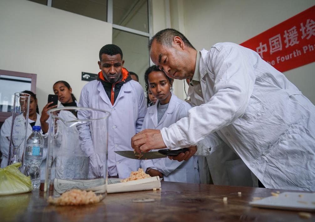 2025年8月20日,在埃塞俄比亞首都亞的斯亞貝巴,中方專(zhuān)家在亞的斯亞貝巴理工學(xué)院對(duì)大學(xué)生進(jìn)行菌種制作技術(shù)指導(dǎo)。新華社記者 韓旭 攝