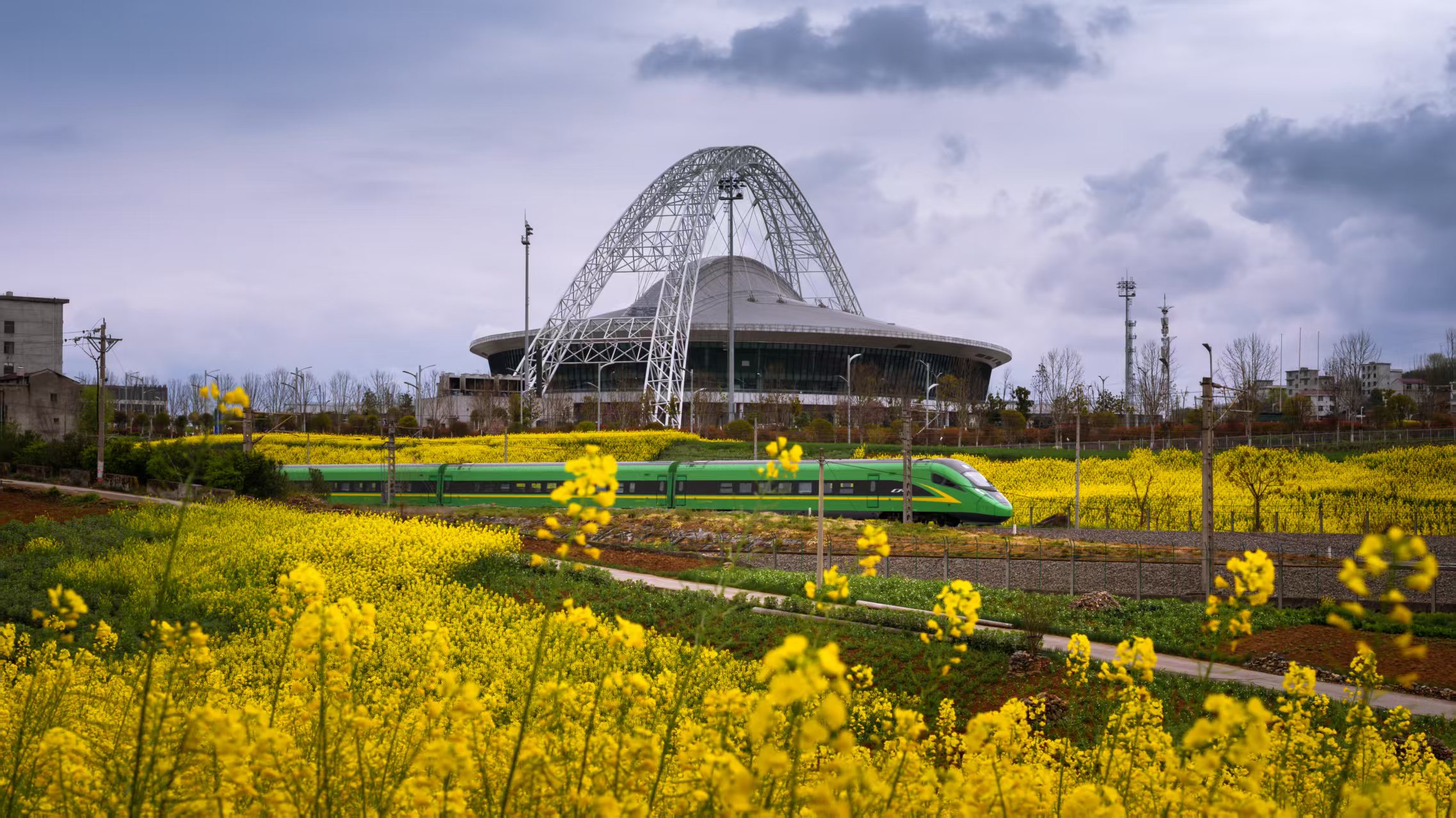3月16日,安康市體育館前,金黃的油菜花海與飛馳的復興號列車相映成趣,盡顯春日生機。王坤侖 攝