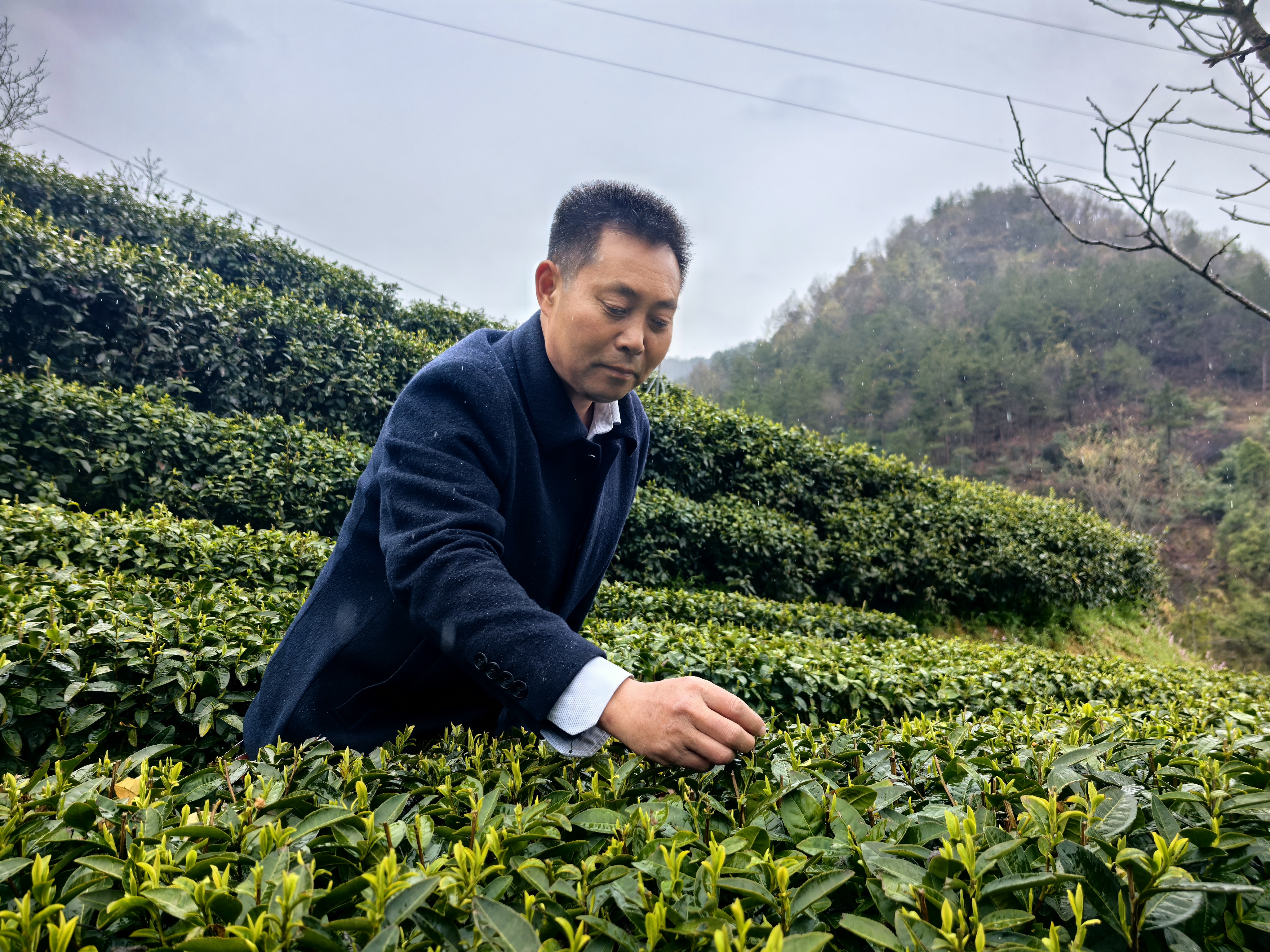 3月15日,康忠實(shí)正在查看茶葉長(zhǎng)勢(shì)。
