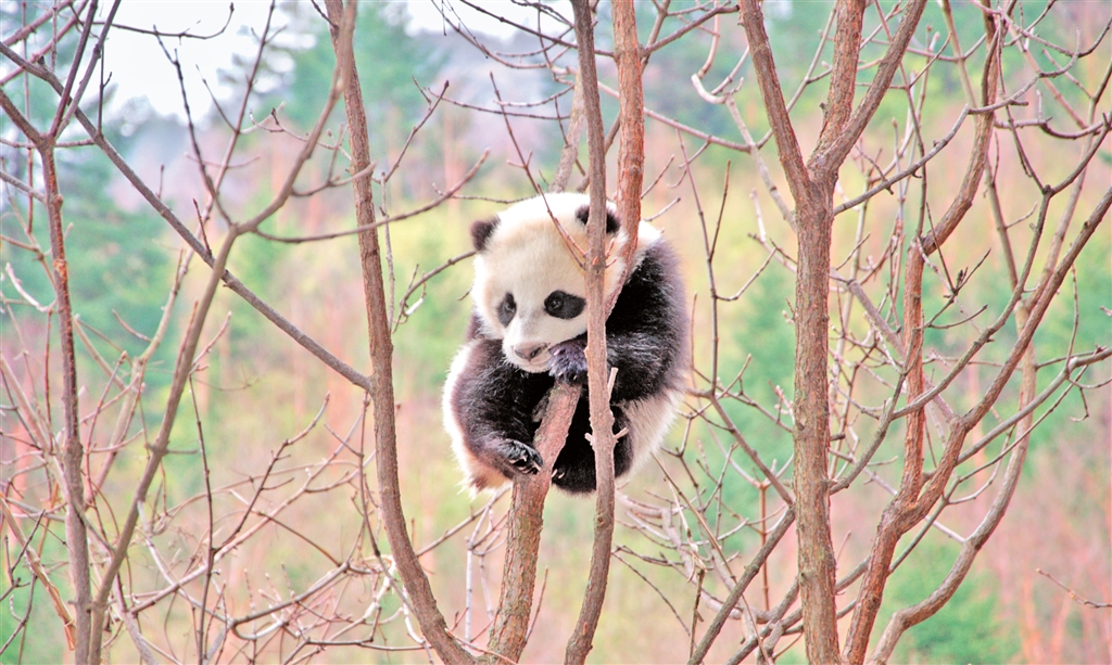 在樹(shù)上躲避天敵、等待母親歸來(lái)的大熊貓幼崽