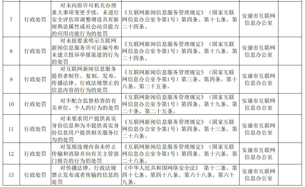 安康市互聯(lián)網(wǎng)信息辦公室行政執(zhí)法事項目錄清單