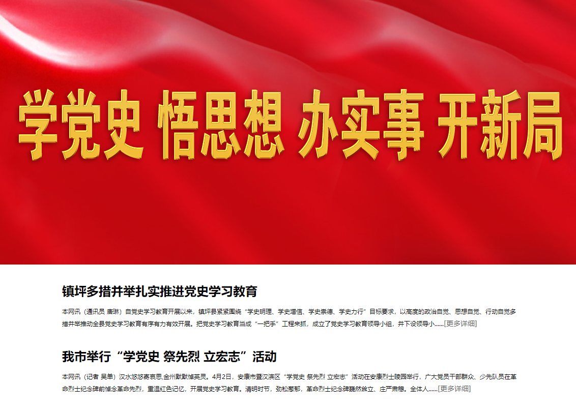 《安康日報》在及時轉載新華社關于中央開展黨史學習教育有關活動的同時,主動跟進報道我市黨史學習教育系列安排部署!栋部等請蟆芳皶r開設“學黨史 悟思想 辦實事 開新局”專欄,刊發(fā)全市黨史學習教育動態(tài)。截至目前,《安康日報》和安康新聞網開設“黨史上的今天”、“慶祝中國共產黨成立100周年”、“學黨史、悟思想、辦實事、開新局”、“奮斗百年路 啟航新征程”等報紙和網站及微信公眾號、視頻號專欄6個,刊發(fā)全市黨史學習教育動態(tài)報道和理論文章300余篇,其中《習近平總書記黨史學習教育動員大會上的重要講話在我市引起熱烈反響》《黨員干部心中植下“三棵樹” 》《在學黨史中增強“三力”》等一批稿件產生積極影響。