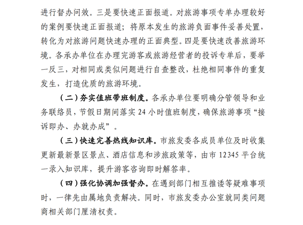 (二)夯實值班帶班制度。各承辦單位要明確分管領(lǐng)導(dǎo)和業(yè)務(wù)聯(lián)絡(luò)員,節(jié)假日期間落實24小時值班制度,確保旅游事項“接訴即辦、辦就辦成”。eHU安康新聞網(wǎng)