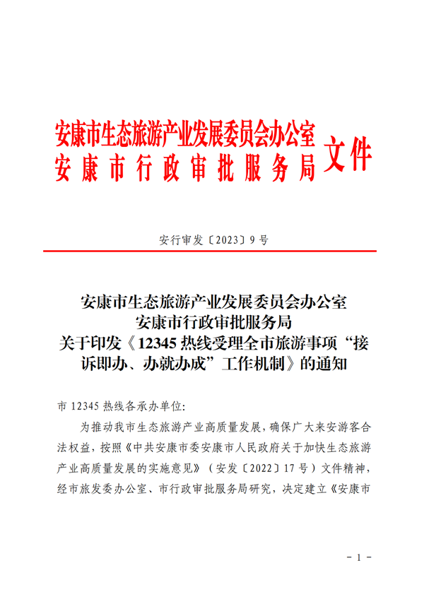 為推動我市生態(tài)旅游產(chǎn)業(yè)高質(zhì)量發(fā)展,確保廣大來安游客合法權(quán)益,按照《中共安康市委安康市人民政府關(guān)于加快生態(tài)旅游產(chǎn)業(yè)高質(zhì)量發(fā)展的實施意見》(安發(fā)〔2022〕17號)文件精神,經(jīng)市旅發(fā)委辦公室、市行政審批服務(wù)局研究,決定建立《安康市12345熱線受理全市旅游事項“接訴即辦、辦就辦成”工作機(jī)制》,請認(rèn)真抓好貫徹落實。eHU安康新聞網(wǎng)