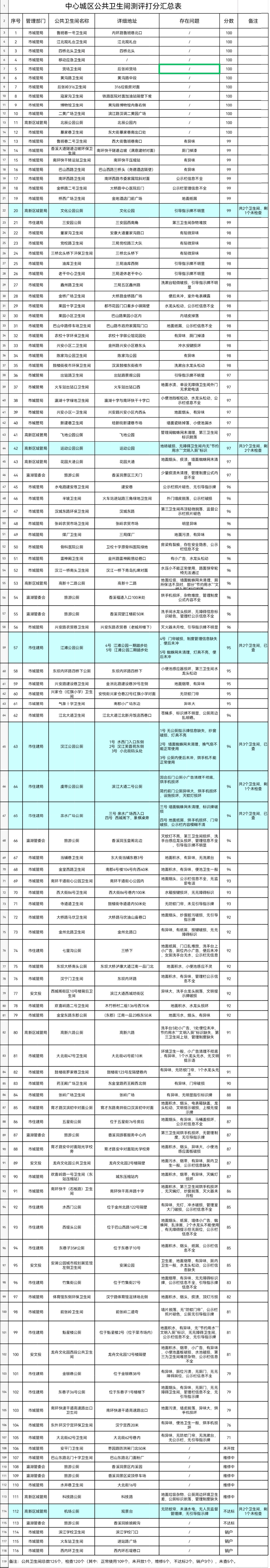 1. “好”等次:魯班巷一號(hào)衛(wèi)生間、江北觀禮臺(tái)衛(wèi)生間、四橋北頭衛(wèi)生間、移動(dòng)應(yīng)急衛(wèi)生間、貨場(chǎng)衛(wèi)生間、黃溝路衛(wèi)生間、后張嶺316衛(wèi)生間、寇家溝衛(wèi)生間、博物館衛(wèi)生間、二黃廣場(chǎng)衛(wèi)生間、北辰公園公廁、暴家巷衛(wèi)生間、魯班巷二號(hào)衛(wèi)生間、香溪大道隧道邊坡環(huán)保衛(wèi)生間、南環(huán)快干轉(zhuǎn)運(yùn)站衛(wèi)生間、巴山西路衛(wèi)生間、南環(huán)西路衛(wèi)生間、金橋路二號(hào)衛(wèi)生間、橋西廣場(chǎng)衛(wèi)生間、文化公園公廁、三安園公廁、董家溝衛(wèi)生間、黨校路衛(wèi)生間、三橋北頭橋下環(huán)保衛(wèi)生間、油庫(kù)衛(wèi)生間、老干中心衛(wèi)生間、鑫州路衛(wèi)生間、金橋廣場(chǎng)衛(wèi)生間、果園十字衛(wèi)生間、果園小區(qū)衛(wèi)生間、巴山中路停車場(chǎng)衛(wèi)生間、農(nóng)校十字環(huán)保衛(wèi)生間、興安小區(qū)二衛(wèi)生間、陳家溝公園衛(wèi)生間、鼓樓街夜市環(huán)保衛(wèi)生間、出站路衛(wèi)生間、火車站出站口衛(wèi)生間、瀛湖十字綠地衛(wèi)生間、興安小區(qū)一衛(wèi)生間、新建巷衛(wèi)生間、飛地公園公廁、運(yùn)動(dòng)公園公廁、花園大道公廁、旅游公廁(香溪洞景三天門)、水電路建安巷衛(wèi)生間、半坡衛(wèi)生間、漢城東路環(huán)保衛(wèi)生間、張嶺農(nóng)貿(mào)市場(chǎng)衛(wèi)生間、煤廠衛(wèi)生間、骨科醫(yī)院公廁、雷神殿衛(wèi)生間、漢江一橋南頭衛(wèi)生間、高新十二路公廁、旅游公廁(香溪福道入口處)、旅游公廁(香溪洞望江樓處)、興安路農(nóng)貿(mào)巷衛(wèi)生間、江灘公園公廁、東壩內(nèi)環(huán)路四橋下公廁、興安路建設(shè)巷衛(wèi)生間、興家倉(cāng)(紅旗小學(xué))衛(wèi)生間、氣象十字衛(wèi)生間。
