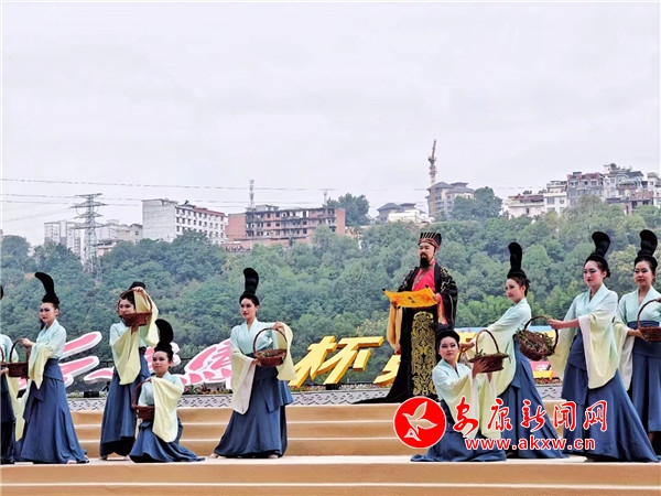悠悠古琴聲中,青衣女子們手提竹籃蹁躚而來。“緬懷先賢”,主祭官一聲令下,全場矚目中,9位大漢護(hù)送屈原像至舞臺中央,開幕式翻開祭祀篇章。主祭官走向高臺仰頸高呼:“詠頌祭文……”百名身著漢服、手持竹簡的孩童齊聲詠頌,頓挫抑揚(yáng),激蕩云霄。“萬民歡慶歌盛世,安瀾裕阜唱安康。”典禮儀成,青衣女子們“兵分兩列”,一列把竹籃里面的粽子拋向江中,追念先賢,一列繞場為現(xiàn)場觀眾贈發(fā)香包,送上幸福安康的祝福。