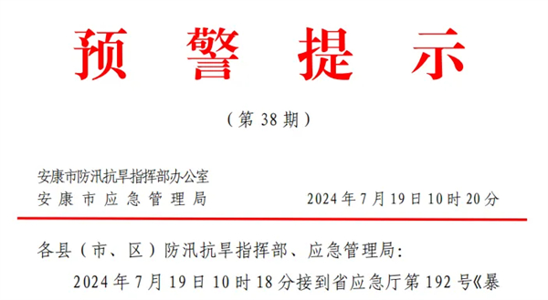 2024年7月19日10時(shí)18分接到省應(yīng)急廳第192號《暴雨橙色預(yù)警》:預(yù)計(jì)未來3小時(shí)我市漢濱區(qū)、寧陜縣降雨量將達(dá)50 毫米以上,未來6小時(shí)我市漢陰縣、石泉縣、旬陽市、白河縣將達(dá)50毫米以上,以上地區(qū)境內(nèi)發(fā)生山洪、泥石流等災(zāi)害風(fēng)險(xiǎn)較高。Yuf安康新聞網(wǎng)