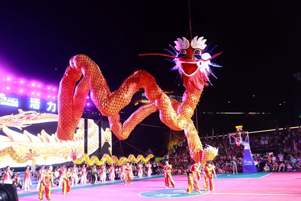 開(kāi)幕式規(guī)模宏大,異常精彩。貴州廣播電視臺(tái)知名節(jié)目主持人、貴州村BA節(jié)目主持人李旭涵、劉子豪兩位重量級(jí)主持人親臨主持,熟練專業(yè)而又激情的引導(dǎo)互動(dòng)為開(kāi)幕式晚會(huì)增添爆棚氛圍。歌手沙寶亮傾情演唱《最初的信仰》《又回首》《暗香》等歌曲,世界散打冠軍、國(guó)家散打隊(duì)主教練許家恒,全國(guó)競(jìng)走冠軍陳珍、全國(guó)青運(yùn)會(huì)冠軍田紫丹的互動(dòng)以及本土節(jié)目《旗開(kāi)得勝》《歡迎你到嵐皋來(lái)》《巴山魔芋情》等將嵐皋豐厚的旅游資源、特色產(chǎn)品、人文風(fēng)情展現(xiàn)得淋漓盡致。無(wú)比酷炫的燈光秀、煙花秀閃耀全場(chǎng),56米巨龍騰空而起,光與影的交織變換構(gòu)成了一幅幅絕妙畫卷,現(xiàn)場(chǎng)掌聲雷動(dòng),喝彩聲、吶喊聲此起彼伏。