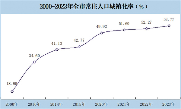 城鎮(zhèn)化步伐明顯加快。1949年,安康總?cè)丝?46.75萬人,其中農(nóng)業(yè)人口占89.4%,屬于典型傳統(tǒng)的農(nóng)村社會,交通不便,人員相對封閉不流動。改革開放后,市場經(jīng)濟體制逐步建立,特別是2000年撤地設市,對安康具有劃時代和里程碑的意義。2021年旬陽撤縣設市,成為陜南首個縣級市,標志著全市城鎮(zhèn)化步伐邁向更高水平。全市抓住東部勞動密集型產(chǎn)業(yè)向中西部轉(zhuǎn)移的機遇,依托易地搬遷集中安置點,大力興辦新社區(qū)工廠,把農(nóng)民變?yōu)榫用,大力開展新環(huán)境、新服務、新產(chǎn)業(yè)、新民風、新生活“五新”社區(qū)創(chuàng)建工作,完善配套設施,健全服務體系,城鎮(zhèn)化建設步伐顯著加快。2023年,全市戶籍人口300.75萬人,常住人口245.72萬人。常住人口城鎮(zhèn)化率由2000年的18.9%,提高到2023年的53.77%,23年間提高了34.87個百分點。3Rk安康新聞網(wǎng)