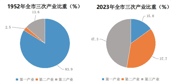 產(chǎn)業(yè)結(jié)構(gòu)日趨優(yōu)化。1952年,全市三次產(chǎn)業(yè)比為83.9︰2.5︰13.6,產(chǎn)業(yè)結(jié)構(gòu)呈“一、三、二”模式,為典型的農(nóng)業(yè)市,隨著工業(yè)經(jīng)濟和第三產(chǎn)業(yè)的不斷發(fā)展,全市第一產(chǎn)業(yè)比重逐年下降,二、三產(chǎn)業(yè)比重逐年上升,2012年三次產(chǎn)業(yè)比為19.4︰42.7︰37.9,第一產(chǎn)業(yè)占比首次低于20.0%,第二產(chǎn)業(yè)突破40.0%,產(chǎn)業(yè)結(jié)構(gòu)呈“二、三、一”模式;隨著第三產(chǎn)業(yè)不斷壯大,2020年占比45.3%,躍居三產(chǎn)之首,呈“三、二、一”模式,并連續(xù)保持4年,2023年全市三次產(chǎn)業(yè)之比15.0︰37.7︰47.3,以服務業(yè)為主的產(chǎn)業(yè)結(jié)構(gòu)加速形成。3Rk安康新聞網(wǎng)