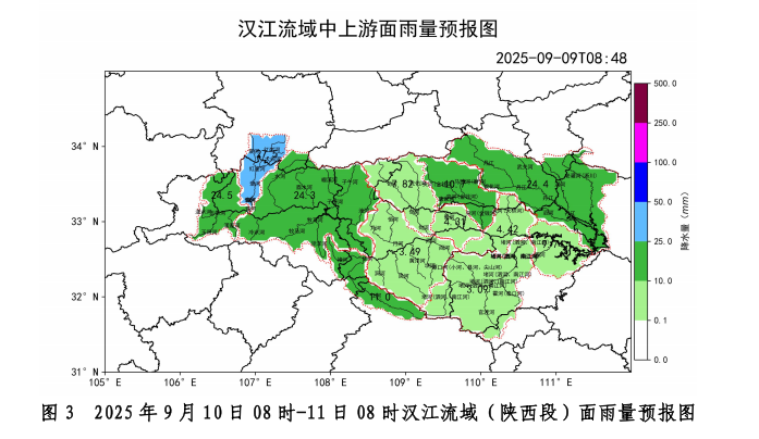 預(yù)計10日08時-11日08時漢江流域(陜西段)大部面雨量0.1~10毫米,玉帶河、酉水河、子午河、任河流域面雨量10-25毫米,褒河流域面雨量25-50毫米(圖3);11日08時-12日08時漢江流域(陜西段)褒河、酉水河、子午河、任河面雨量25~50毫米,其余中小河流流域面雨量10~25毫米(圖4);12日08時-13日08時漢江流域(陜西段)任河、堵河流域面雨量達(dá)10~25毫米,其余中小河流流域面雨量0.1~10毫米(圖5)。
