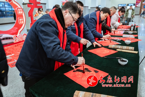 活動(dòng)另一邊,7名來(lái)自安康地區(qū)的鐵路書(shū)法家們?cè)诤蜍?chē)室內(nèi)揮毫潑墨,一氣呵成,將一副副飽含著美好祝愿的春聯(lián)和一張張洋溢著節(jié)日喜慶的“福”字送到旅客手中,讓旅客的春運(yùn)旅途充滿濃濃“年味”。