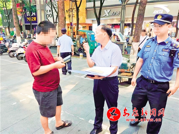 7月18日上午,漢濱城管執(zhí)法分局“‘痰’吐文雅,舉‘紙’得體”糾治組在金州路、白天鵝廣場(chǎng)以及公交車站附近巡查值守,對(duì)取證發(fā)現(xiàn)的隨地吐痰不文明行為進(jìn)行法規(guī)宣傳教育,并采取罰款、微信朋友圈發(fā)公益廣告集贊等形式給予糾治。李東 攝QNs安康新聞網(wǎng)