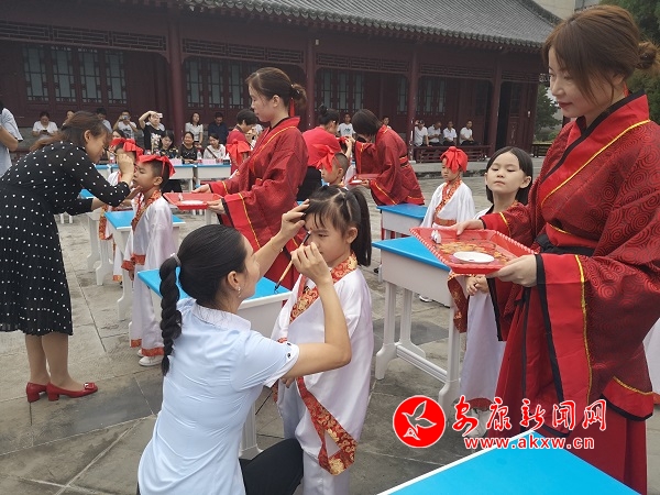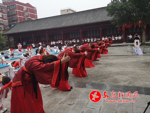 據(jù)了解,“開筆禮”是中國古代人生“四大禮”之首,是蒙童入學(xué)階段極為重要的儀式。“開筆禮”儀式主要分成六項(xiàng)內(nèi)容,每一項(xiàng)內(nèi)容承載著特定的教育目的。“正衣冠”要求學(xué)子們養(yǎng)成干凈整潔的生活習(xí)慣;“感恩鞠躬”讓學(xué)子向師長行揖禮,謝師恩、謝親恩,并為師者和長輩奉茶,讓他們從小懂得孝親尊師的道理;“凈手凈心”讓學(xué)子們從此靜心讀書,心無旁騖;“朱砂啟智”,表達(dá)了師長對(duì)學(xué)子們的美好祝愿,希望他們心明眼亮,聰慧過人;“擊鼓明志”讓學(xué)子們樹立遠(yuǎn)大的理想與目標(biāo);“開筆啟蒙”書寫“人”字,學(xué)會(huì)做人的道理。蒙童通過親身經(jīng)歷這種莊嚴(yán)古樸的儀式,實(shí)現(xiàn)從蒙童到學(xué)生的心理過渡。yS4安康新聞網(wǎng)