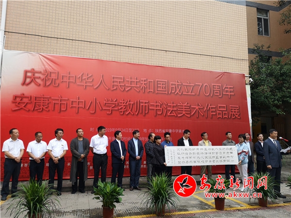 本網(wǎng)訊(實習(xí)記者 雷文鈺)為慶祝中華人民共和國成立70周年,安康市中小學(xué)教師,用一份特殊的禮物向偉大的祖國獻禮,9月24日上午,由安康市教育體育局主辦,安康市教研室、陜西省安康中學(xué)、安康市教育學(xué)會、安康市中小學(xué)美術(shù)教育研究會承辦,安康市書法家協(xié)會、安康市群藝館、陜西省于右任書法學(xué)會安康分會、陜南畫院協(xié)辦的“輝煌七十載,筑夢新時代”慶祝新中國成立七十周年安康市中小學(xué)教師書法美術(shù)作品展在安康中學(xué)美術(shù)館啟幕。