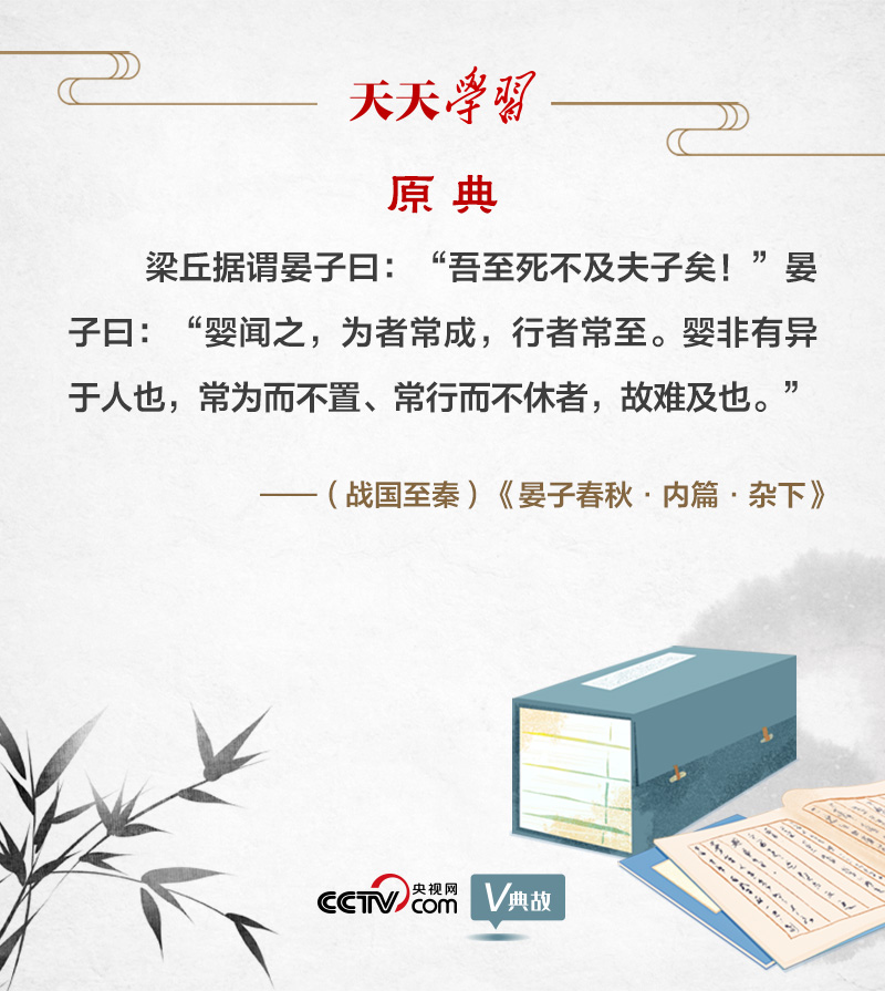 “為者常成,行者常至”,出自春秋時(shí)期齊相晏子與大夫梁丘據(jù)的一段對(duì)話(huà)。梁丘據(jù)與晏子既是朋友,也是政治對(duì)手。一次,他對(duì)晏子說(shuō):“我恐怕到死也趕不上先生您了!”晏子說(shuō):“我聽(tīng)說(shuō),努力去做的人通常可以成功,不倦前行的人常?梢缘竭_(dá)目的地。我和別人比并沒(méi)有什么不同,只是經(jīng)常做個(gè)不停、走個(gè)不停罷了,所以很難被趕上。”