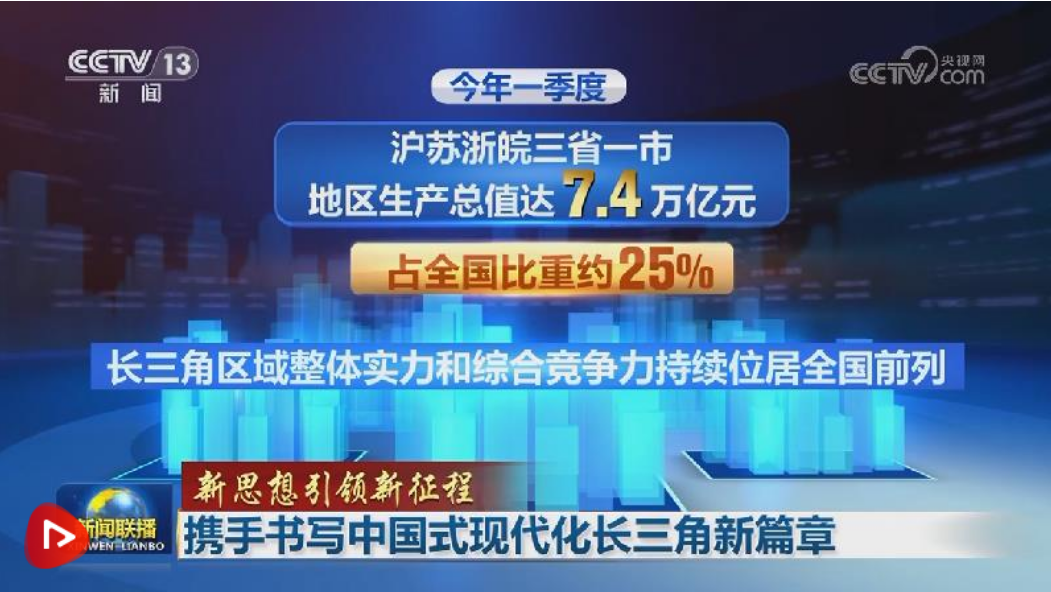 長三角地區(qū)以4%的國土面積,集聚了全國約17%的人口,創(chuàng)造了全國近1/4的經(jīng)濟總量,是經(jīng)濟最活躍、開放程度最高、創(chuàng)新能力最強的區(qū)域之一。今年一季度,滬蘇浙皖三省一市地區(qū)生產(chǎn)總值達7.4萬億元,占全國比重約25%,長三角區(qū)域整體實力和綜合競爭力持續(xù)位居全國前列。