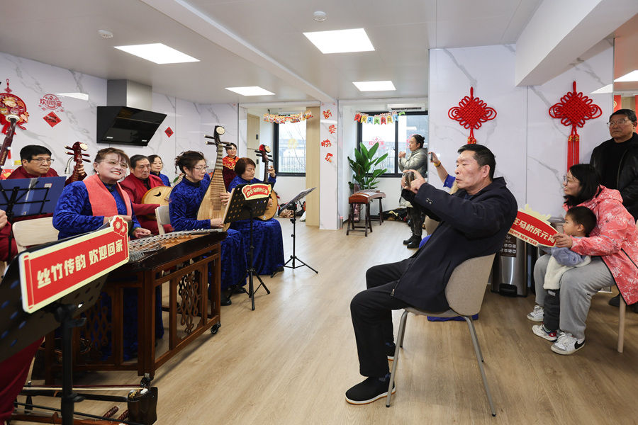 民樂(lè)隊(duì)在上海市閔行區(qū)新時(shí)代城市建設(shè)者管理者之家演奏(2024年2月23日攝)。新華社記者王翔 攝Hia安康新聞網(wǎng)