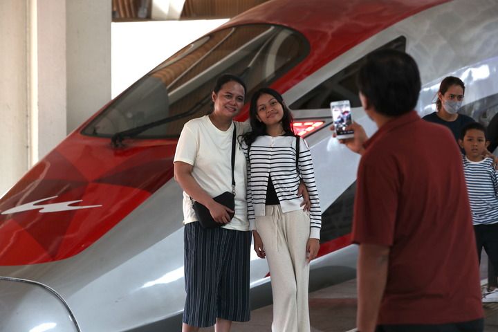 6月19日,在印度尼西亞雅加達哈利姆站站臺,兩名乘客與雅萬高鐵高速動車組列車合影。 新華社記者 岑云鵬 攝Efv安康新聞網
