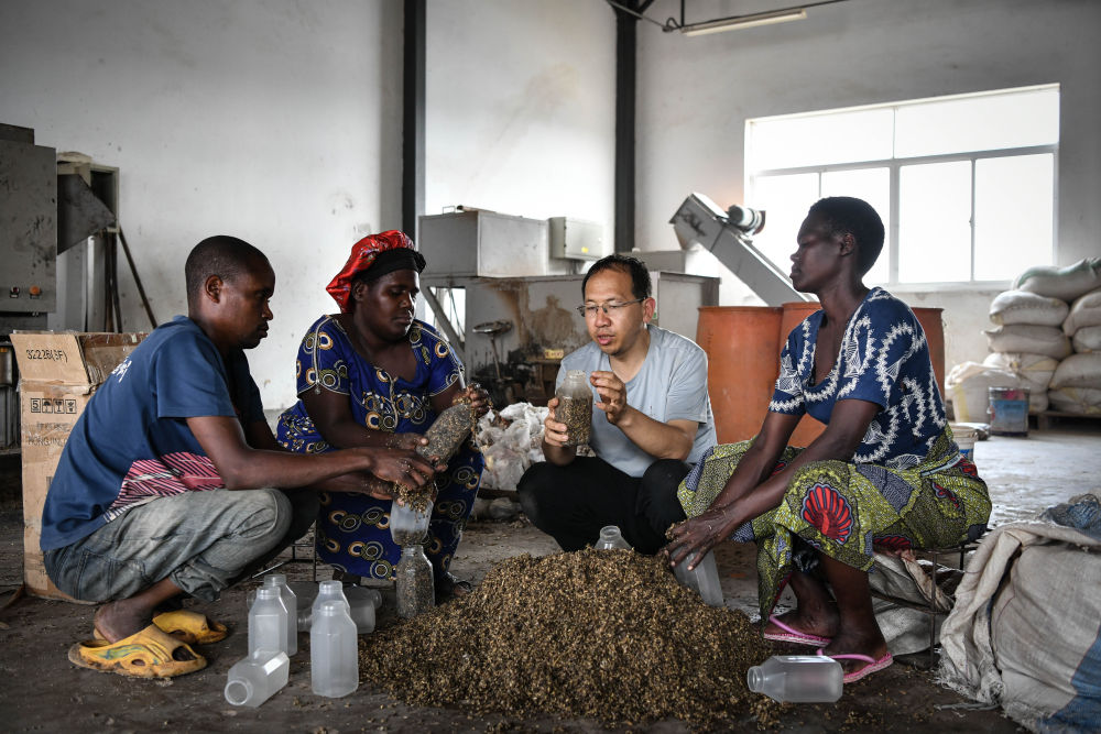 2024年8月13日,在盧旺達南方省胡耶區(qū)的中國援盧農業(yè)技術示范中心,菌草專家陳曉斌(右二)與當地農民一起制作菌種培養(yǎng)料。新華社記者 韓旭 攝Efv安康新聞網
