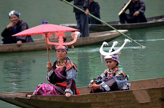 圖為船頭撐傘的苗族新娘。中新社發(fā) 趙剛 攝貴州省黔南布依族苗族自治州三都縣打魚(yú)鄉(xiāng)苗族村寨來(lái)術(shù)村一直奉行著古老的“水上送親”婚俗,每當(dāng)舉行“水上送親、……