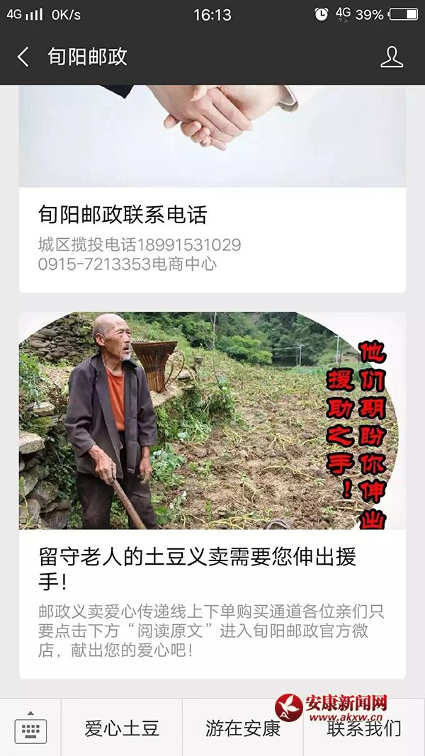 一是關(guān)注旬陽(yáng)郵政微信公眾號(hào),點(diǎn)擊右下角的“愛(ài)心土豆”鏈接,進(jìn)入旬陽(yáng)郵政官方微店直接購(gòu)買;