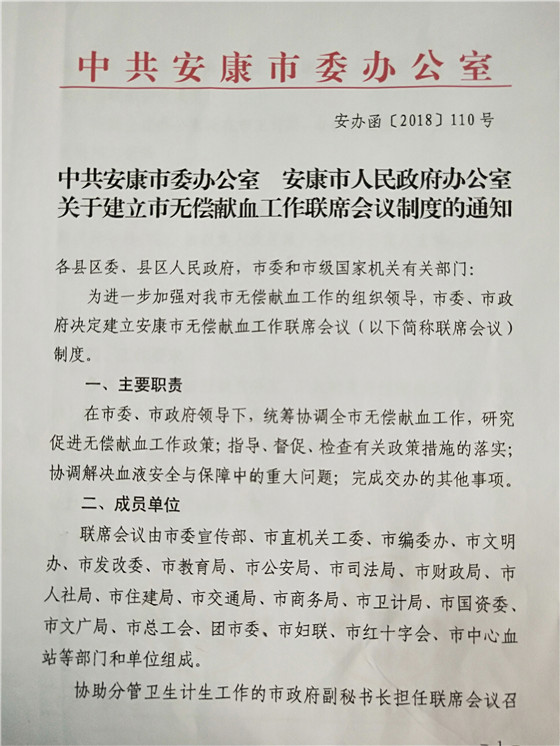 2、安康市率先在全省建立首個(gè)無(wú)償獻(xiàn)血聯(lián)系會(huì)議制度 安康無(wú)償獻(xiàn)血聯(lián)席會(huì)議制度是在安康市委、市政府領(lǐng)導(dǎo)下,由市委宣傳部等21個(gè)市級(jí)部門(mén)和單位組成,協(xié)助分管衛(wèi)生計(jì)生工作的市政府副秘書(shū)長(zhǎng)擔(dān)任聯(lián)席會(huì)議召集人。聯(lián)席會(huì)議每年召開(kāi)一次全體會(huì)議,主要職責(zé)為統(tǒng)籌協(xié)調(diào)全市無(wú)償獻(xiàn)血工作,研究促進(jìn)無(wú)償獻(xiàn)血工作相關(guān)政策,指導(dǎo)、督促、檢查有關(guān)政策措施的執(zhí)行落實(shí),協(xié)調(diào)解決血液安全與保障中的重大問(wèn)題。聯(lián)系會(huì)議制度的建立,標(biāo)志著我市無(wú)償獻(xiàn)血宣傳招募模式“政府主導(dǎo)、部門(mén)協(xié)作、社會(huì)參與、城鄉(xiāng)聯(lián)動(dòng)”的發(fā)展格局和長(zhǎng)效機(jī)制得到進(jìn)一步鞏固和提升。vDu安康新聞網(wǎng)